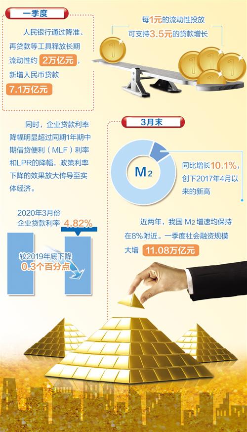 從引導(dǎo)貸款投放看,一季度中國(guó)人民銀行通過降準(zhǔn)、再貸款等工具釋放長(zhǎng)期流動(dòng)性約2萬億元,新增人民幣貸款7.1萬億元,每1元的流動(dòng)性投放可支持3.5元的貸款增長(zhǎng),是1∶3.5的倍數(shù)放大效應(yīng)。