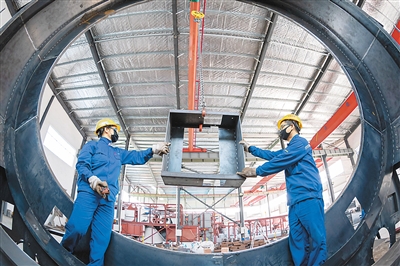 今年以來(lái),江蘇省海安市在科學(xué)防控疫情的同時(shí),及時(shí)為企業(yè)解難紓困,幫助民營(yíng)企業(yè)迅速恢復(fù)產(chǎn)能、拓展國(guó)內(nèi)外市場(chǎng),保持經(jīng)濟(jì)平穩(wěn)運(yùn)行,確保務(wù)工人員有崗上、有活干、有錢(qián)賺。圖為5月17日,在海安市白甸鎮(zhèn)一企業(yè)車(chē)間內(nèi),工人在趕制建材裝備訂單。翟慧勇攝(人民視覺(jué))