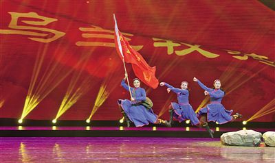 蘇尼特右旗烏蘭牧騎隊(duì)員演出《一支輕騎兵從這里出發(fā)》。 記者 王磊 攝
