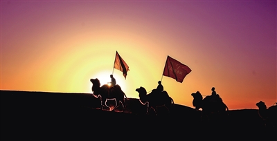 行走在大漠夕陽下的駝背宣講團(tuán)。記者 馬建荃 攝