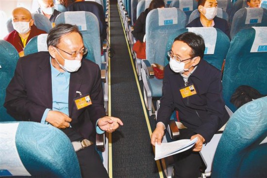 5月20日,全國政協(xié)委員、西藏人民醫(yī)院副院長(zhǎng)格桑羅布(左)與全國政協(xié)委員、西藏大學(xué)科研處處長(zhǎng)圖登克珠在前往北京途中就如何在全國兩會(huì)上建言獻(xiàn)策、履職盡責(zé)進(jìn)行交流。本報(bào)記者 旦增西旦 攝