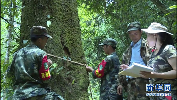 5月19日,云南高黎貢山國(guó)家級(jí)自然保護(hù)區(qū)保山管護(hù)局騰沖分局工作人員在給滇桐測(cè)量胸徑。新華社發(fā)(陳曉丹攝)