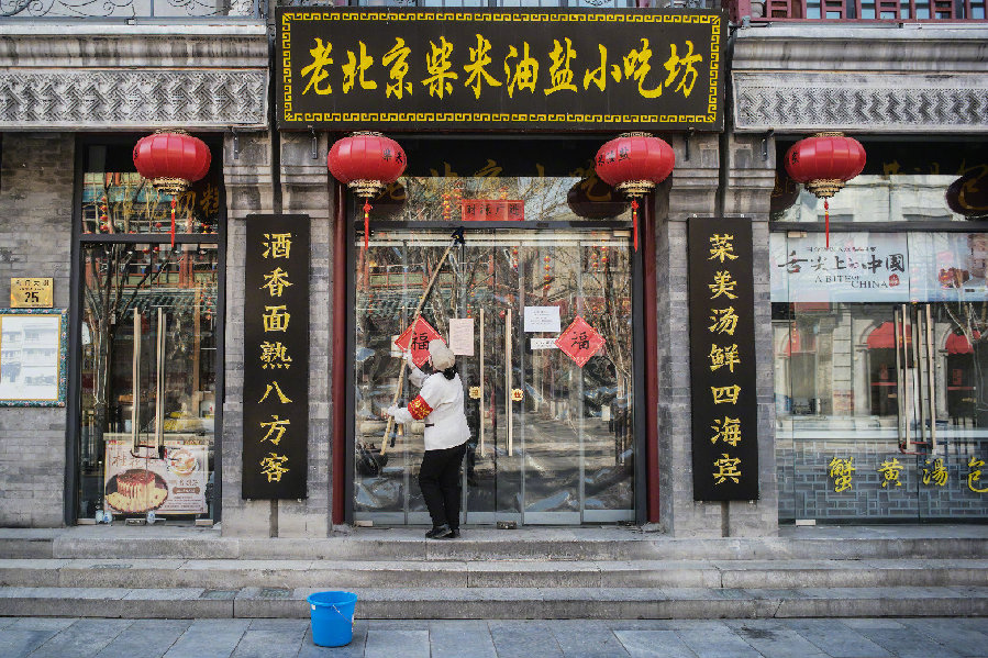 在北京前門(mén)大街,清潔工人打掃店鋪的門(mén)窗。(新華社記者彭子洋 攝)