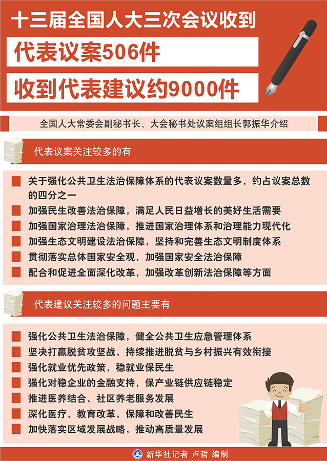 記者26日從十三屆全國人大三次會議秘書處獲悉,到大會主席團決定的代表提出議案截止時間5月25日12時,大會秘書處共收到代表提出的議案506件。同時,收到代表建議約9000件。