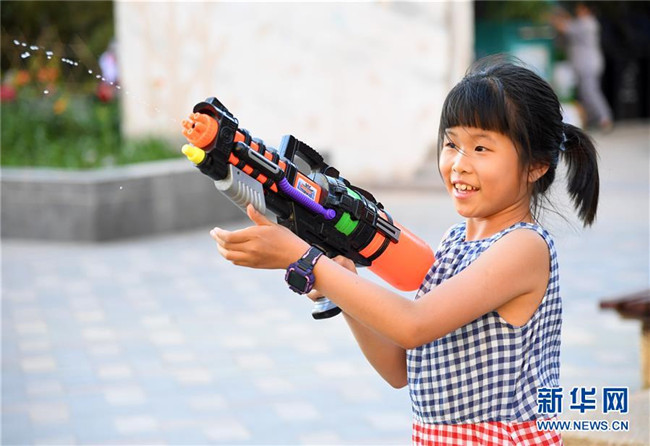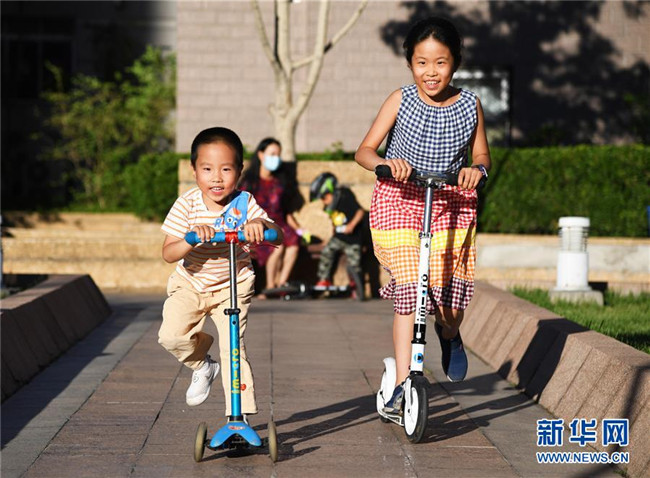 5月31日,在北京市海淀區(qū)中關(guān)村街道新科祥園社區(qū)廣場(chǎng),小朋友們?cè)谕嫠?。新華社記者 任超 攝