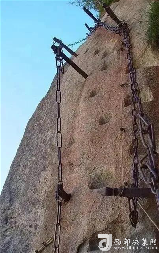 華山還有一處常人不敢涉足的險(xiǎn)境--- 鷂子翻身。鷂子翻身在華山東峰是通往下棋亭的必由之路。其路鑿于懸崖上,下視唯見寒索垂于凌空,不見路徑。游人至此,需面壁挽索,以腳尖探尋石窩,交替而下,其中幾步需如鷹鷂一般、左右翻轉(zhuǎn)身體才可通過。此景只留英雄客,婦孺難聞幾聲咳。這句話現(xiàn)在也未然,巾幗不讓須眉,以后應(yīng)是往來無懼者,皆是英雄客了。