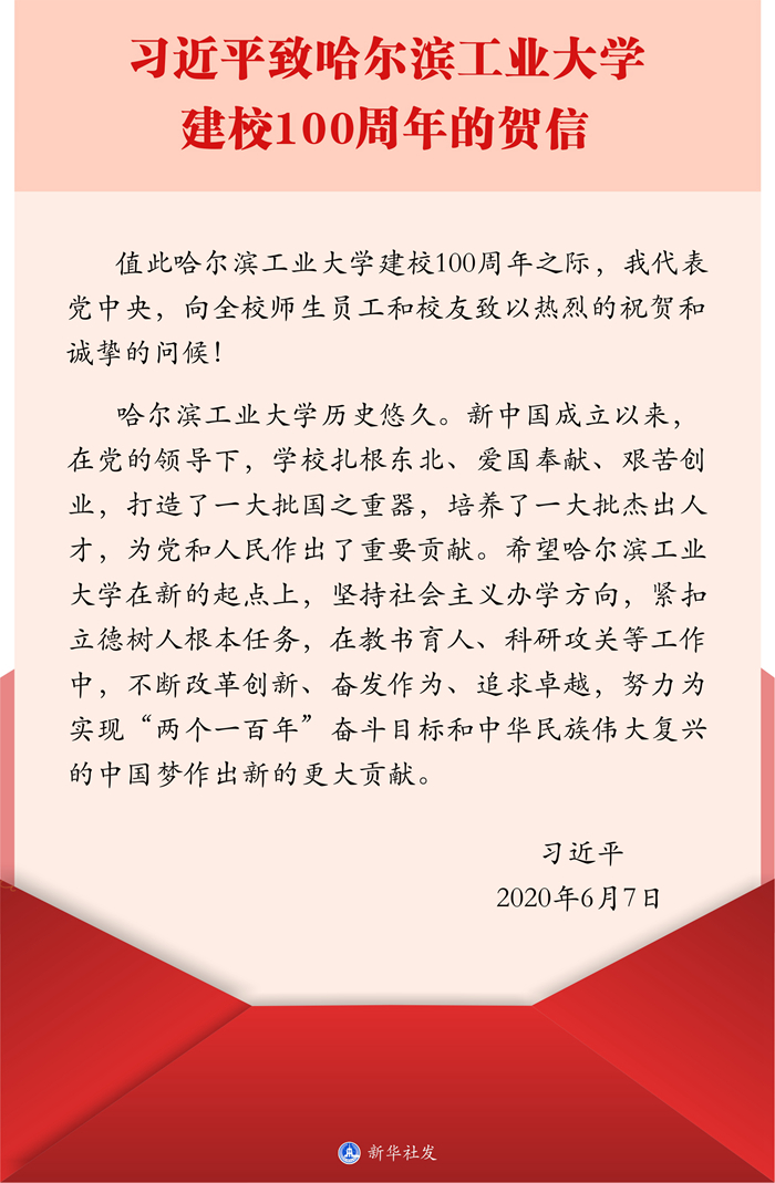 中共中央總書記、國(guó)家主席、中央軍委主席習(xí)近平7日致信祝賀哈爾濱工業(yè)大學(xué)建校100周年,向全校師生員工和校友致以熱烈的祝賀和誠(chéng)摯的問候。