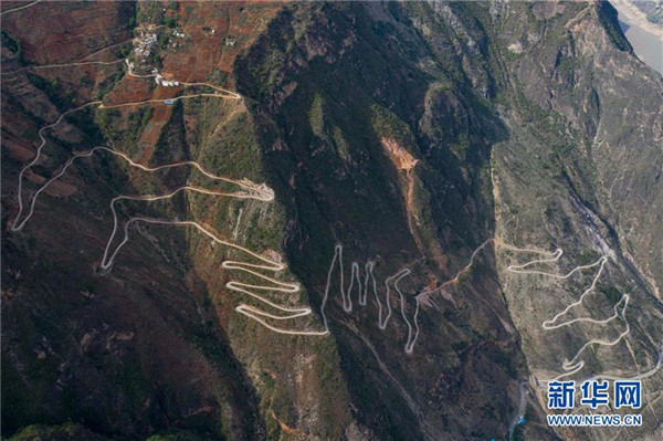 金陽縣蘆稿鎮(zhèn)大灣子村12公里左右的通村公路,28個彎蜿蜒盤旋在金沙江峽谷懸崖絕壁邊(6月7日攝,無人機照片)。坐落在金沙江畔的四川省金陽縣是國家級深度貧困縣,境內(nèi)群山連綿起伏,海拔落差大,眾多村寨處于高山或者高半山上,道路施工難度大。近年來,當(dāng)?shù)卣畬⒔煌ㄗ鳛槊撠毠缘南葘?dǎo)性工程,路越修越寬、越修越好,成為當(dāng)?shù)厝罕姷拿撠氈赂宦?。截?019年底,金陽縣實現(xiàn)所有鄉(xiāng)鎮(zhèn)通油路、建制村通硬化路,鄉(xiāng)道里程達329.9公里,村道里程達866.8公里。新華社記者江宏景攝