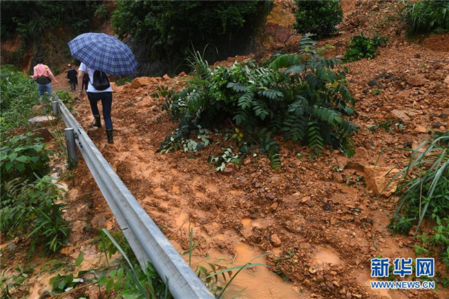 在廣西永??h堡里鎮(zhèn)板峽村,人們經過山體滑坡路段(6月9日攝)。新華社記者 陸波岸 攝