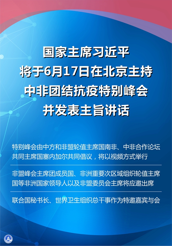 外交部發(fā)言人華春瑩16日宣布:國(guó)家主席習(xí)近平將于6月17日在北京主持中非團(tuán)結(jié)抗疫特別峰會(huì),并發(fā)表主旨講話。