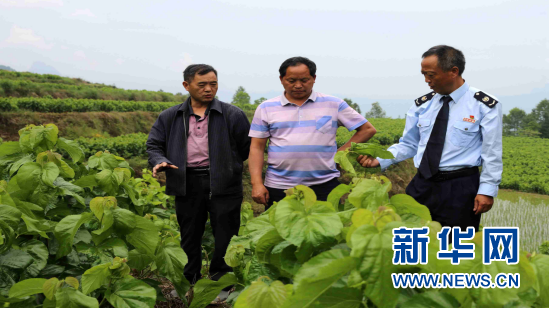 養(yǎng)蠶大戶(hù)鄧遂洪(左一)介紹桑樹(shù)防蟲(chóng)技術(shù)。新華網(wǎng)發(fā)(重慶稅務(wù)供圖)