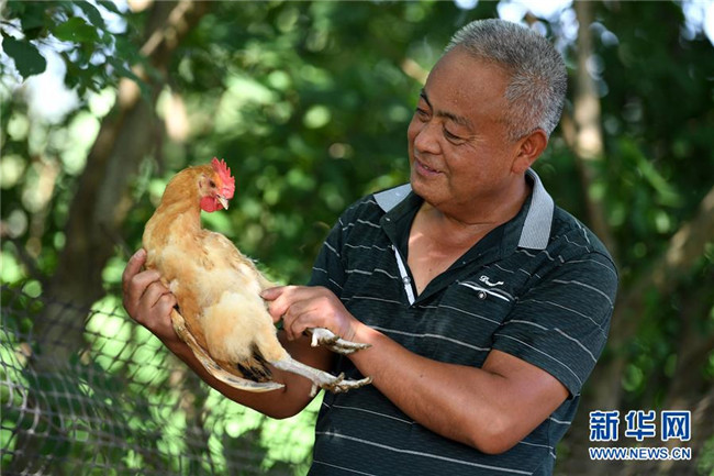 6月26日,在肥西縣花崗鎮(zhèn)楊灣村的土雞養(yǎng)殖基地里,黃榮春在查看土雞長勢。新華社記者 劉軍喜 攝