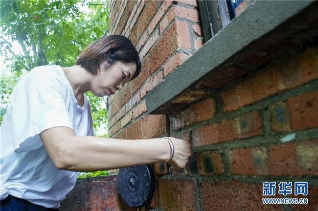 7月1日,地質(zhì)災(zāi)害監(jiān)測員侯芳對一處農(nóng)房的墻上裂縫寬度進(jìn)行測量。 新華社記者 劉潺 攝