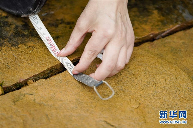 7月1日,地質(zhì)災(zāi)害監(jiān)測員侯芳在古家坳不穩(wěn)定斜坡地質(zhì)災(zāi)害點的一條裂縫前進(jìn)行測量工作。新華社記者 劉潺 攝