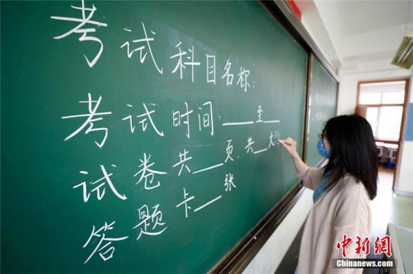 7月3日,北京十二中老師布置考場。該校共設(shè)標準考場33間,備用考場3間,將有660名考生在此考試。 中新社記者 富田 攝