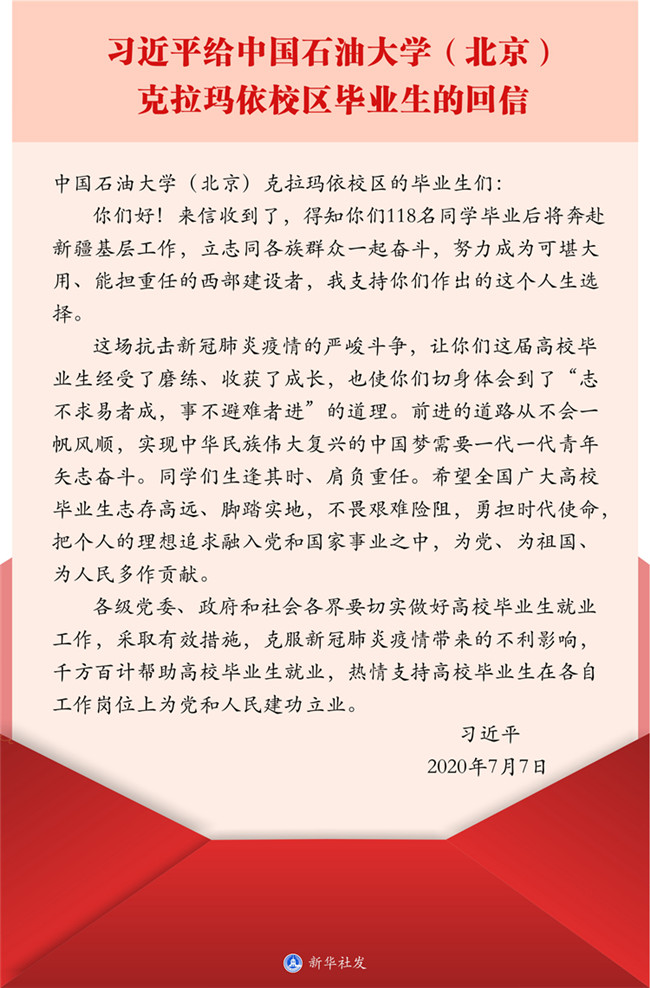 “志不求易者成,事不避難者進”。7月7日,習近平給中國石油大學(北京)克拉瑪依校區(qū)畢業(yè)生回信,對重新起航的學子們殷殷叮囑,支持他們到邊疆基層工作的選擇,鼓勵他們克難前行,寄語廣大高校畢業(yè)生把個人的理想追求融入黨和國家事業(yè)之中。