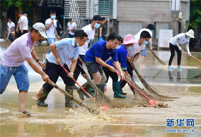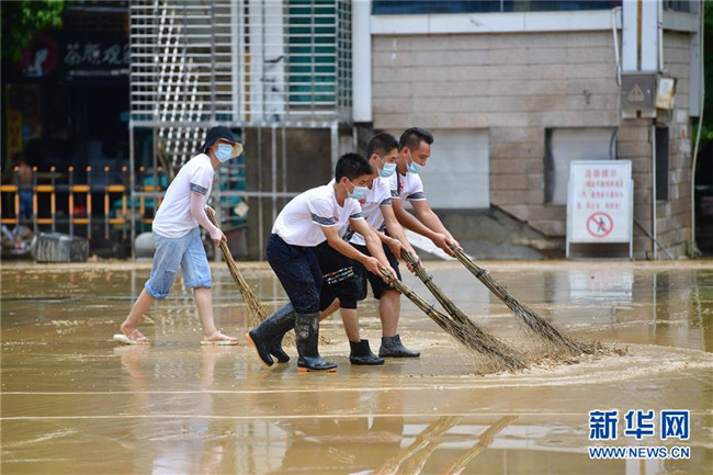7月12日,融水苗族自治縣文化體育廣電和旅游局清淤小分隊在蘆笙廣場清理地面。新華社記者 黃孝邦 攝
