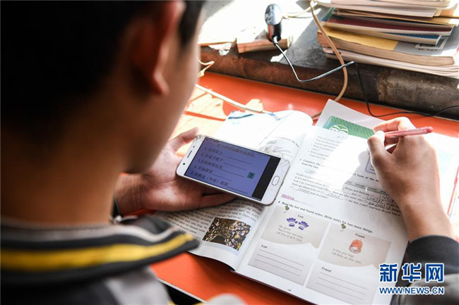 內(nèi)蒙古準(zhǔn)格爾旗龍口鎮(zhèn)紅樹梁村的初一學(xué)生劉進(jìn)才在家中上網(wǎng)課(3月10日攝)。新華社記者 劉磊 攝