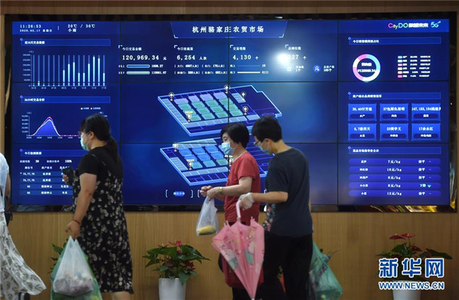 浙江省杭州市的5G農(nóng)貿(mào)市場(chǎng)——駱家莊農(nóng)貿(mào)市場(chǎng)的大屏幕上實(shí)時(shí)顯示交易、客流等相關(guān)情況(5月17日攝)。新華社記者 韓傳號(hào) 攝