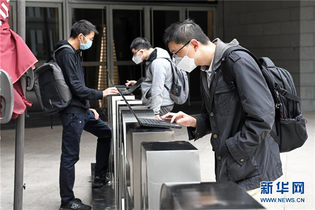 在深圳平安金融中心,企業(yè)員工在樓下使用筆記本電腦連接公司內(nèi)網(wǎng)下載安裝遠(yuǎn)程辦公軟件,以便實(shí)現(xiàn)居家“云辦公”(2月10日攝)。新華社記者 梁旭 攝