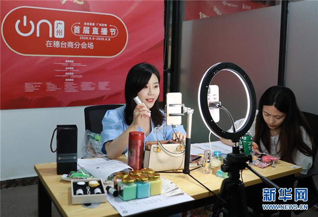 6月6日,廣州啟動(dòng)“首屆直播節(jié)”活動(dòng),這是主播在廣州市白云區(qū)臺(tái)商分會(huì)場(chǎng)直播帶貨。新華社記者 盧燁 攝
