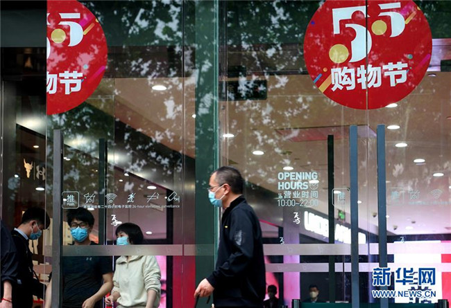 這是上海淮海路一家商場的“五五購物節(jié)”標識(5月5日攝)。5月4日晚,上海首次啟動大規(guī)模商業(yè)促銷活動“五五購物節(jié)”,多家在線新經濟企業(yè)參與。 新華社記者 劉穎 攝