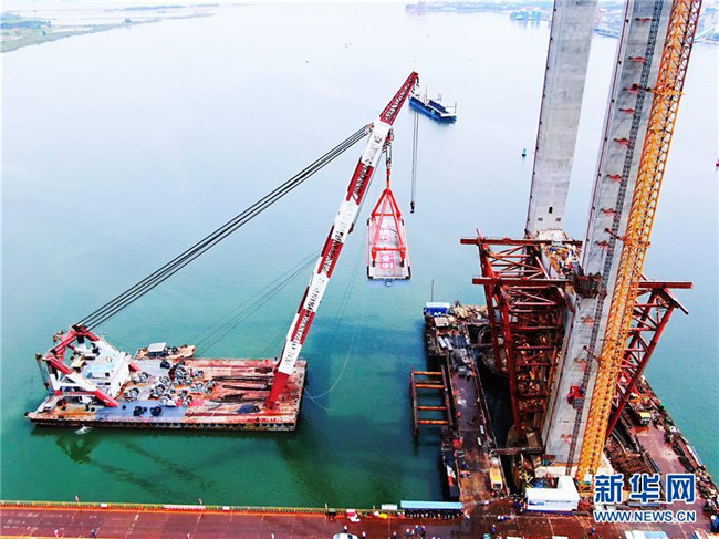 這是5月29日拍攝的廣東湛江調順跨海大橋施工現(xiàn)場(無人機照片)。 新華社記者 盧燁 攝