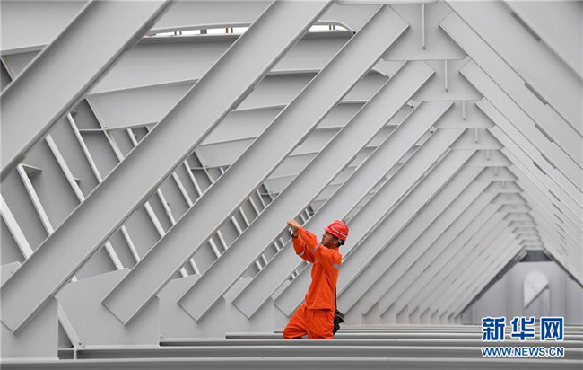 6月20日,建設者在河南孟州黃河大橋工地施工。 新華社記者 郝源 攝