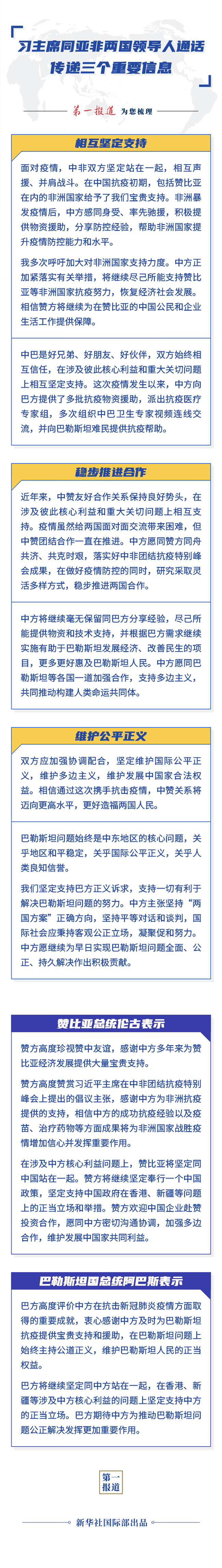 習(xí)近平強調(diào),近年來,中贊友好合作關(guān)系保持良好勢頭,在涉及彼此核心利益和重大關(guān)切問題上相互支持。疫情雖然給兩國面對面交流帶來困難,但中贊團結(jié)合作一直在推進。中方愿同贊方同舟共濟、共克時艱,落實好中非團結(jié)抗疫特別峰會成果,在做好疫情防控的同時,研究采取靈活多樣方式,穩(wěn)步推進兩國合作。雙方應(yīng)加強協(xié)調(diào)配合,堅定維護國際公平正義,維護多邊主義,維護發(fā)展中國家合法權(quán)益。相信通過這次攜手抗擊疫情,中贊關(guān)系將邁向更高水平,更好造福兩國人民。