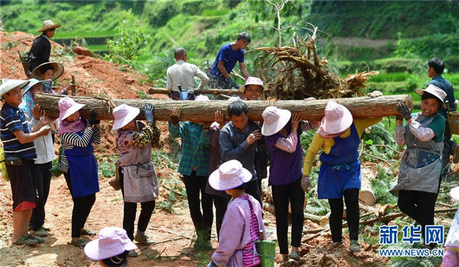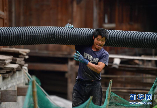 在烏英苗寨,村民在搬運(yùn)排污管道,準(zhǔn)備鋪設(shè)(7月7日攝)。 新華社記者 黃孝邦 攝