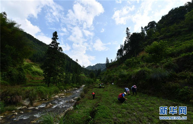 在烏英苗寨,村民們?cè)谏缴峡改绢^,為產(chǎn)業(yè)路施工做準(zhǔn)備(7月30日攝)。 新華社記者 黃孝邦 攝
