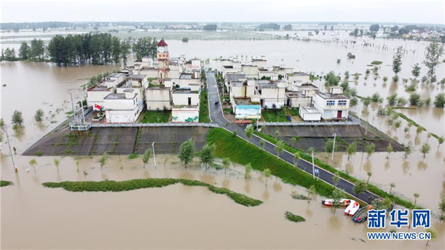 這是被洪水包圍的安徽省阜南縣曹集鎮(zhèn)西田坡莊臺(tái),蓄洪區(qū)內(nèi)的所有莊臺(tái)上都有黨員干部值守(7月24日攝,無人機(jī)照片)。 新華社記者 張端 攝