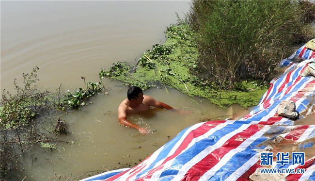 7月25日,安徽省廬江縣白山鎮(zhèn)金大圩段值班人員、黨員徐經(jīng)寶在水中處理險(xiǎn)情。 新華社發(fā)(錢良好攝)