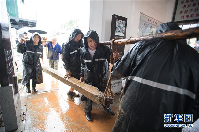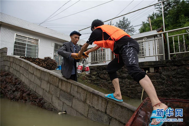 7月7日,湖南省常德市石門縣雁池鄉(xiāng)重福橋村的干部(右)為被困群眾運(yùn)送生活物資。 新華社記者 陳思汗 攝