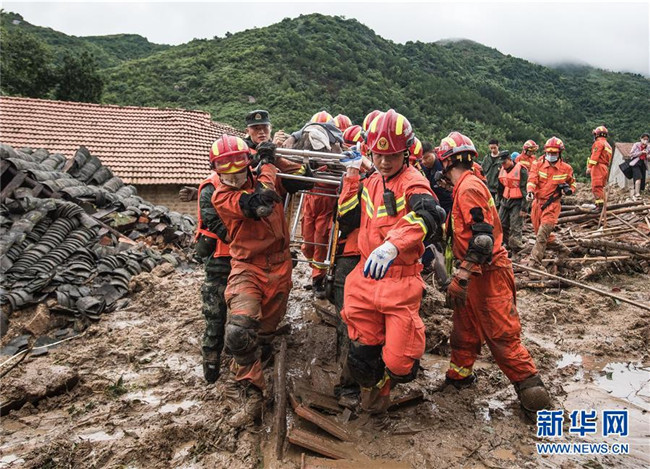 7月8日,在湖北黃岡市黃梅縣袁山村山體滑坡現(xiàn)場(chǎng),救援人員轉(zhuǎn)移救出的年過八旬的老人。 新華社記者 肖藝九 攝
