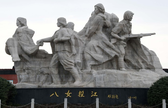 她們是東北抗日聯(lián)軍第5軍婦女團(tuán)的政治指導(dǎo)員冷云,班長(zhǎng)胡秀芝、楊貴珍,戰(zhàn)士郭桂琴、黃桂清、王惠民、李鳳善和被服廠廠長(zhǎng)安順福。1938年10月,該部在牡丹江地區(qū)烏斯渾河渡口與日偽軍千余人遭遇。已行至河邊準(zhǔn)備渡河的婦女團(tuán)8名成員,為掩護(hù)大部隊(duì)突圍,毅然放棄渡河,在冷云率領(lǐng)下,分成3個(gè)戰(zhàn)斗小組,與日偽軍展開激戰(zhàn)。她們主動(dòng)吸引日偽軍火力,使部隊(duì)主力得以迅速擺脫敵人的攻擊,但她們卻被敵人圍困于河邊。在背水作戰(zhàn)至彈盡的情況下,面對(duì)日偽軍逼降,女戰(zhàn)士們誓死不屈。她們毀掉槍支,挽臂涉入烏斯渾河,高唱著《國際歌》,集體沉江,壯烈殉國。犧牲時(shí),她們年齡最大的冷云23歲,最小的王惠民才13歲。