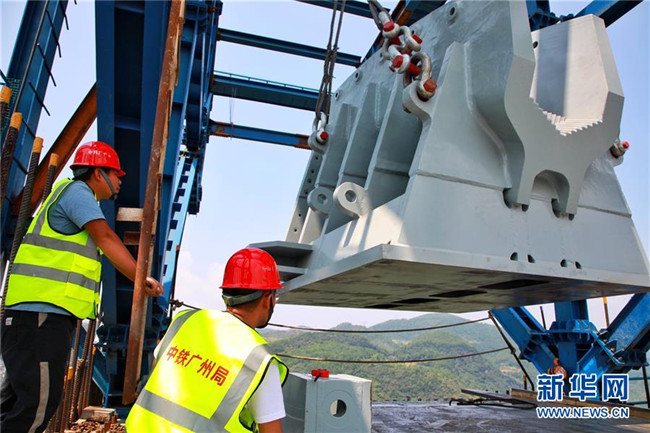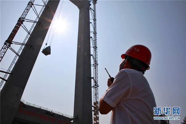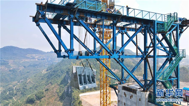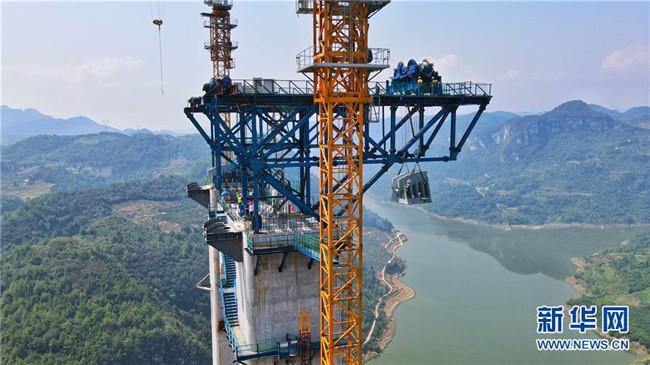 9月1日,工作人員在對(duì)主索鞍進(jìn)行吊裝。新華社記者劉續(xù)攝