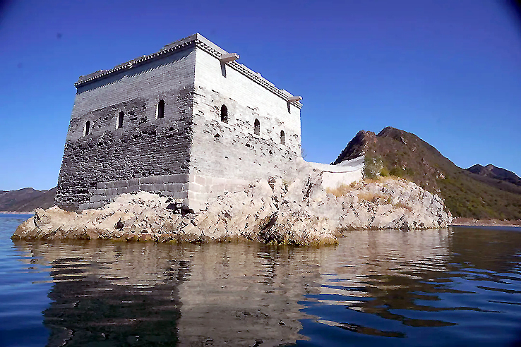 潘家口水庫“水下長城”,一船只從城墻邊駛過(攝于2012年)。新華社發(fā)(朱建軍 攝)