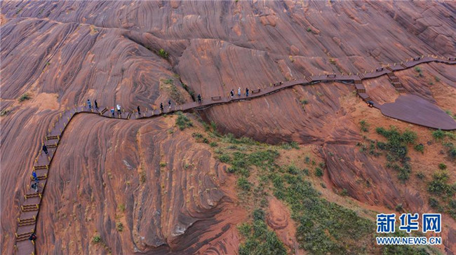 游人在靖邊縣龍洲鎮(zhèn)波浪谷丹霞景區(qū)游覽(9月24日攝,無人機(jī)照片)。新華社記者 陶明 攝