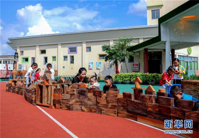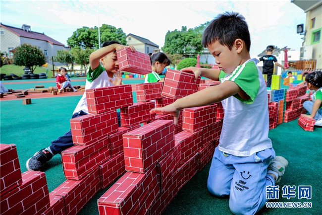 9月28日,孩子們?cè)诖罱?ldquo;萬(wàn)里長(zhǎng)城”。新華社記者 徐昱 攝