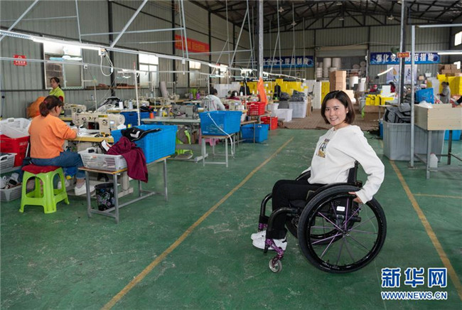 10月13日,殘疾女青年楊淑亭在湖南省邵陽市城步縣自己開辦的湖南七七科技股份有限公司生產(chǎn)車間里。1991年出生的苗族姑娘楊淑亭因車禍胸部以下高位截癱,通過不斷學(xué)習(xí)摸索,開辦網(wǎng)店并注冊(cè)了自己的企業(yè),與周邊貧困家庭簽訂合作協(xié)議,制作售賣具有民族特色的背包和仿真花卉,帶動(dòng)上千名貧困人員及59名殘疾人就業(yè)。