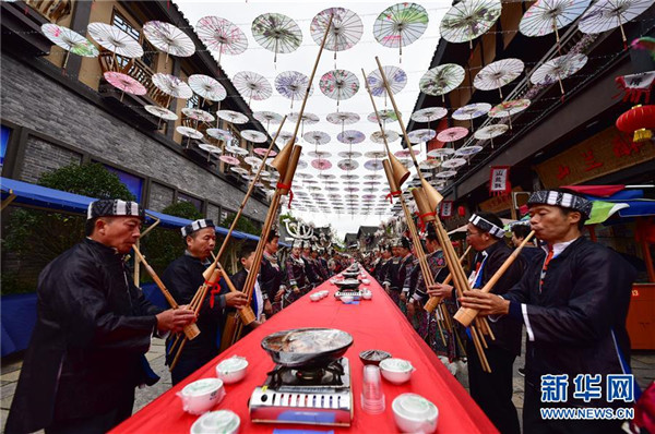 10月18日,苗族群眾在貴州省丹寨縣萬(wàn)達(dá)小鎮(zhèn)吃新節(jié)長(zhǎng)桌宴上助興。當(dāng)日,貴州省黔東南苗族侗族自治州丹寨縣萬(wàn)達(dá)小鎮(zhèn)舉辦苗族吃新節(jié)體驗(yàn)活動(dòng)。當(dāng)?shù)孛缱逋J笙舞、品長(zhǎng)桌宴,并邀請(qǐng)游客參與其中,大家在歡聲笑語(yǔ)中樂(lè)享金秋。新華社發(fā)(楊武魁攝)