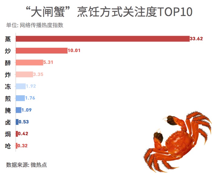 在“吃貨”眼里,占據(jù)C位的仍是最著名的“中華絨螯蟹”,也就是人們俗稱的“大閘蟹”。在“不同蟹類網(wǎng)絡(luò)關(guān)注度調(diào)查”中,大閘蟹名列前茅,緊隨其后的是梭子蟹和青蟹 。