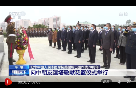 當?shù)貢r間21日,以中共中央總書記、國家主席、中央軍委主席習(xí)近平名義向朝鮮平壤中朝友誼塔、檜倉中國人民志愿軍烈士陵園敬獻花籃儀式在朝鮮舉行。中國駐朝鮮大使率全體館員及其他在朝中方人員代表出席。