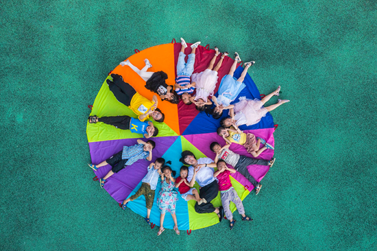 9月9日,江西省吉安市新干縣城上鄉(xiāng)中心幼兒園支教幼師敖敏慧(黃衣服)和劉智秀(白衣服)正在指導(dǎo)該園幼兒開展降落傘游戲。視覺中國(guó)供圖