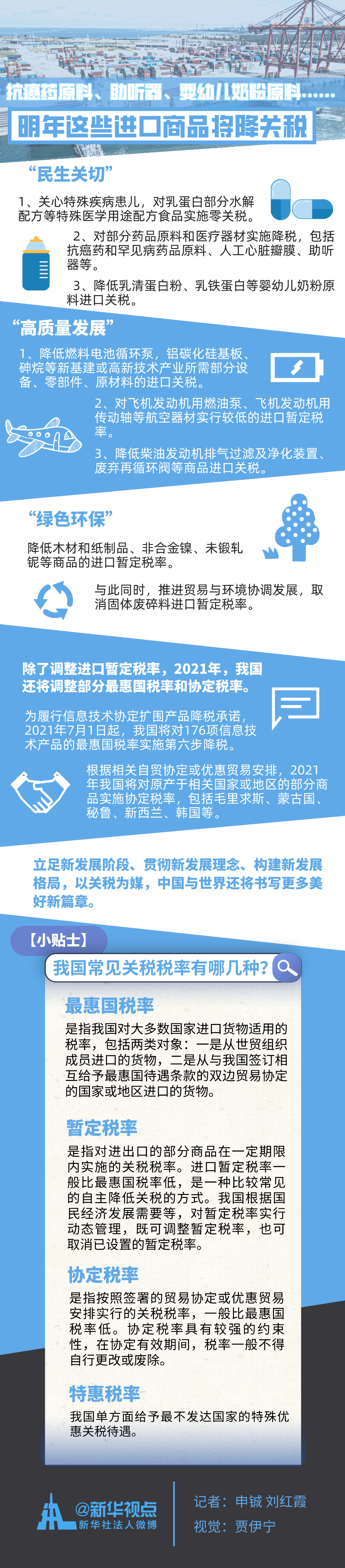 每逢年末,我國都會根據(jù)經(jīng)濟社會發(fā)展情況對新一年的部分商品的關稅稅率進行調(diào)整。國務院關稅稅則委員會23日印發(fā)2021年關稅調(diào)整方案,決定從明年1月1日開始,對883項商品實施低于最惠國稅率的進口暫定稅率,抗癌藥原料、助聽器、嬰幼兒奶粉原料等跟百姓生活密切相關的商品均在其中。同時,隨著中國對外開放持續(xù)擴大,部分協(xié)定稅率、最惠國稅率也將在明年降低。(記者申鋮、劉紅霞)