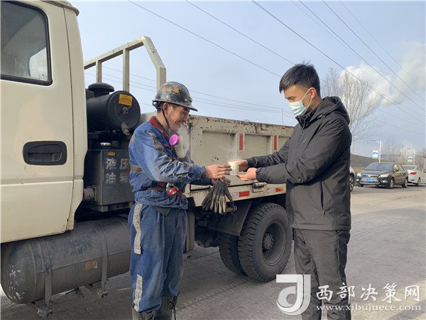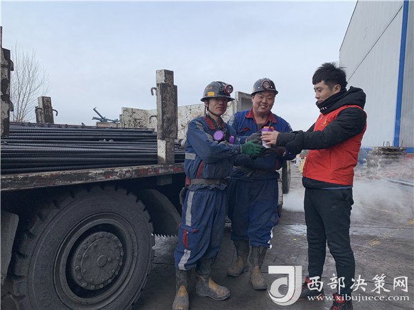 寒風阻擋不住一心為職工送溫暖的熱情,該支部黨員志愿者冒著嚴寒,為地面室外下料職工送上了一雙雙厚實保暖的手套、暖心的奶茶,囑咐他們注意保暖,預防感冒,特殊天氣更要提高防護意識,確保安全生產。