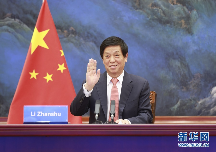 1月18日,全國(guó)人大常委會(huì)委員長(zhǎng)栗戰(zhàn)書在北京人民大會(huì)堂出席全國(guó)人大和柬埔寨國(guó)會(huì)視頻交流活動(dòng)開幕式?!⌒氯A社記者 丁林 攝