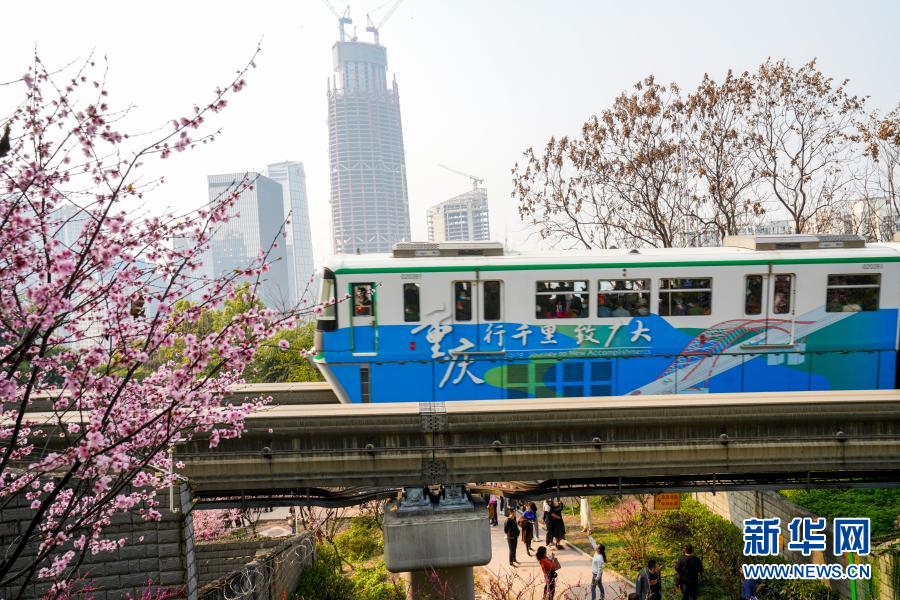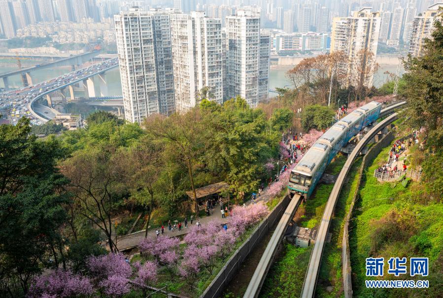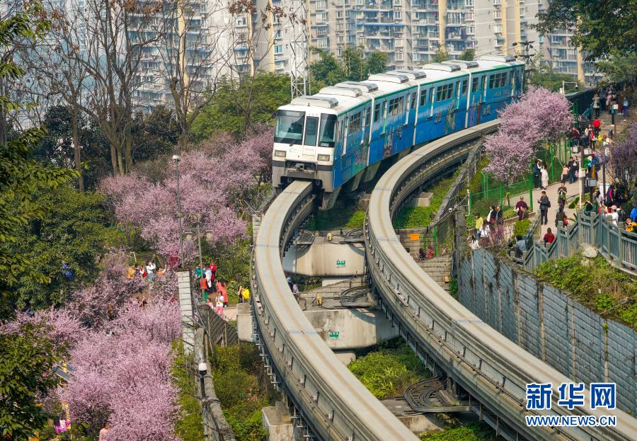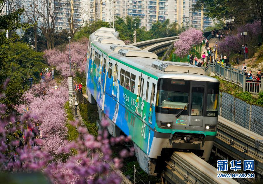 2月23日,在重慶軌道交通2號線佛圖關(guān)段,一列單軌列車穿越花海奔馳而過。新華社記者 劉潺 攝