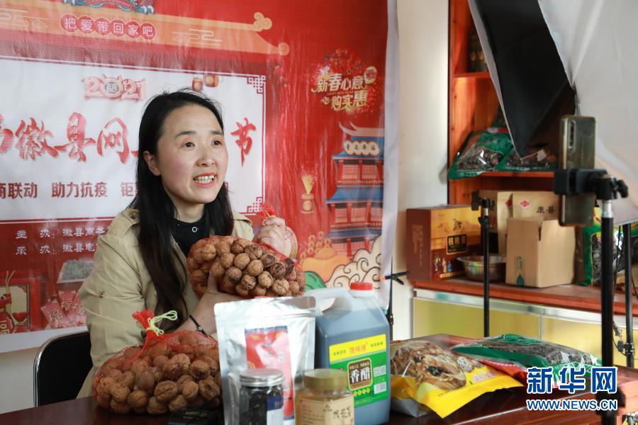 2月23日,在位于甘肅隴南市徽縣的店鋪中,全國(guó)人大代表梁倩娟在網(wǎng)上直播銷售當(dāng)?shù)剞r(nóng)特產(chǎn)品。 新華社記者 張智敏 攝